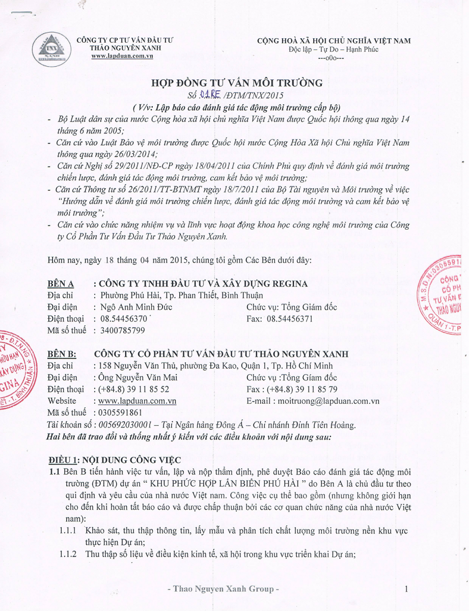 Hợp Đồng BÁo Cáo Đánh Giá Tác Động Môi Trường (Cấp Bộ) Dự Án LẤN BIỂN PHÚ HÀI